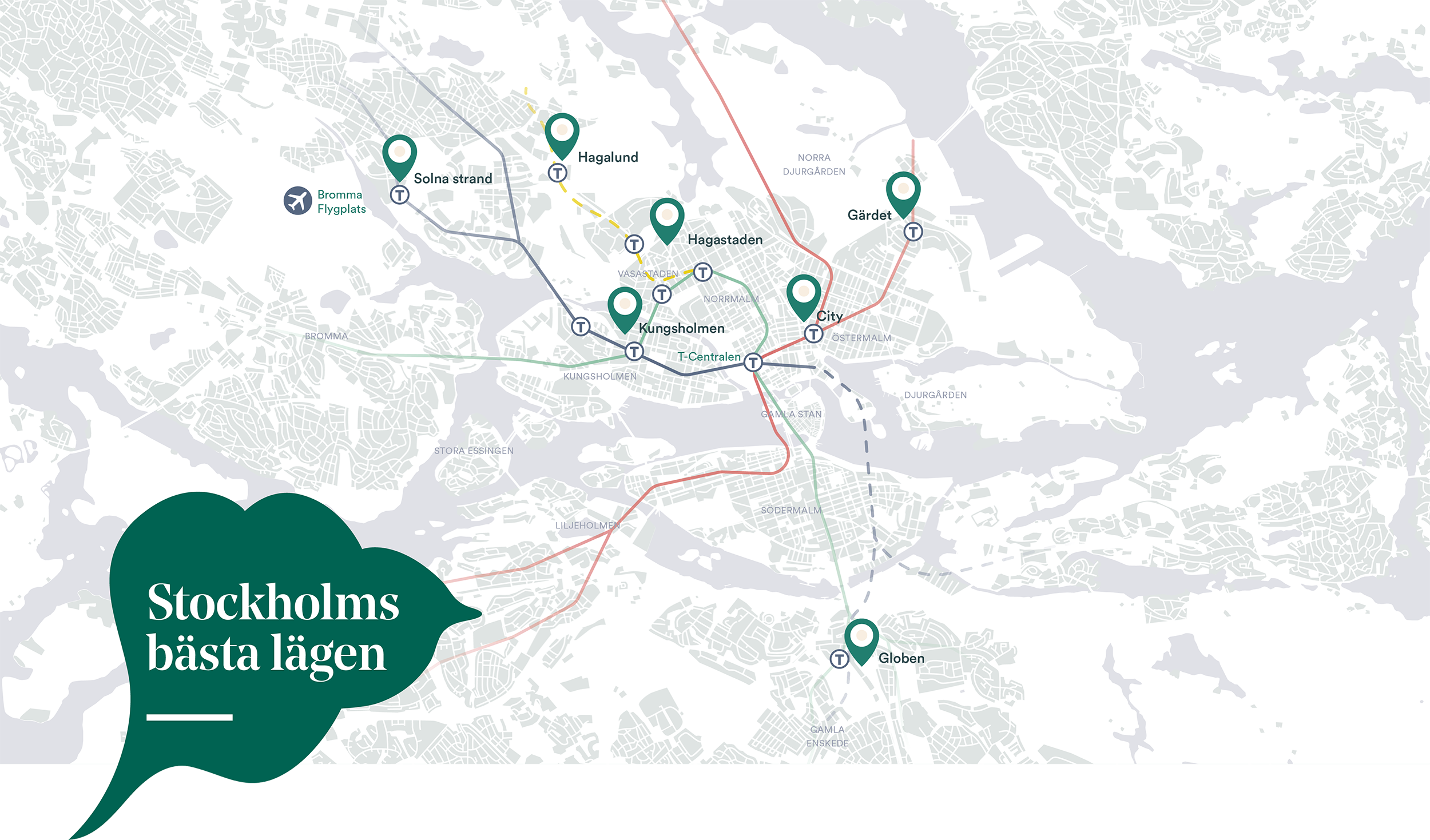 Ytterligare en gemensam nämnare för alla våra fastigheter är de goda kommunikationerna – alla fastigheter ligger i tunnelbanenära lägen, det gäller inom några år även fastigheterna i Hagalund genom utbyggnaden av den Gula tunnelbanelinjen.