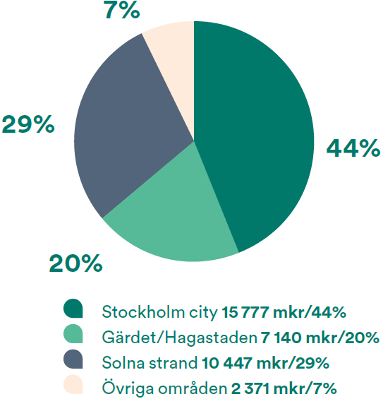 Humlegården äger och förvaltar 59 fastigheter i några av Stockholms mest attraktiva lägen. Ett samlat fastighetsbestånd ger oss möjlighet att se till helheten och skapa ett starkt kunderbjudande. Vi verkar på platser som kännetecknas av attraktiva lägen med stor efterfrågan, starkt serviceutbud och en spännande framtid. Varje område har sin egen karaktär och innebär sammantaget ett brett och varierat utbud av lokaler.