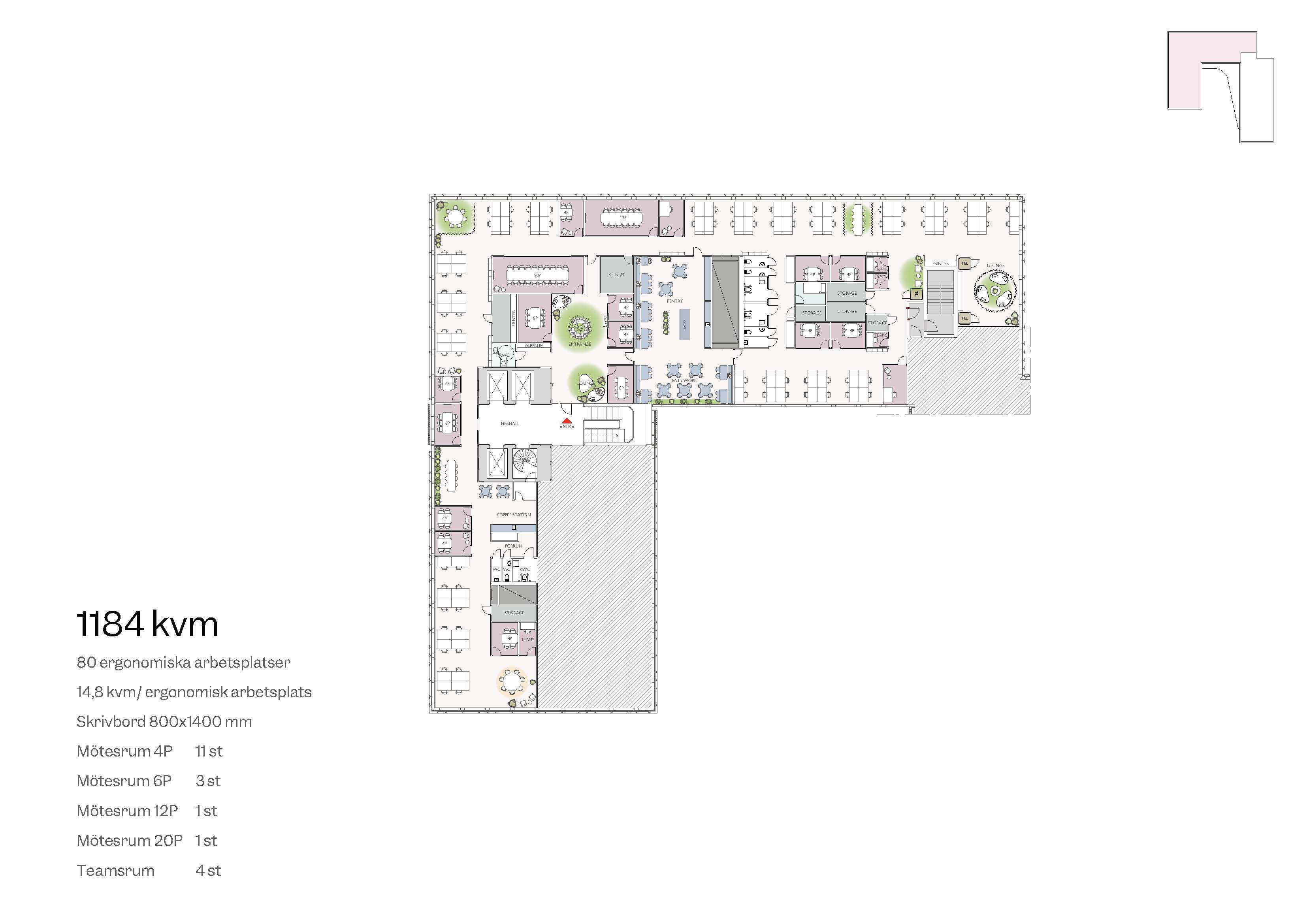 Lokalen har stora generösa fönster och god takhöjd med 2,70 till undertak. Det ligger installationsgolv vilket tillåter stor frihet i möbleringen. Kontorsytorna är såväl flexibla som ytsmarta och kan hantera ner till 1 person/10kvm. Huset är energieffektivt och har närvarostyrda ventilations- och belysningssystem. Husets designval av mattor, pentry och mötesrumspartier är hållbara och medvetna materialval. De har en skandinavisk neutral kulörpalett vilket harmoniserar med huset och ger stor frihet till att sätta accentfärger med egna möbler och textilier. Bifogad planlösning är ett förslag på utformning. När vi vet mer om era behov och önskemål justerar vi lokalen utifrån dem. Utöver egna lokaler har ni tillgång till husets alla faciliteter så som gemensamma ytor för möten och sociala sammankomster, konferensytor, reception, café, bar, restaurang, takterrasser, gym, duschar och omklädningsrum.