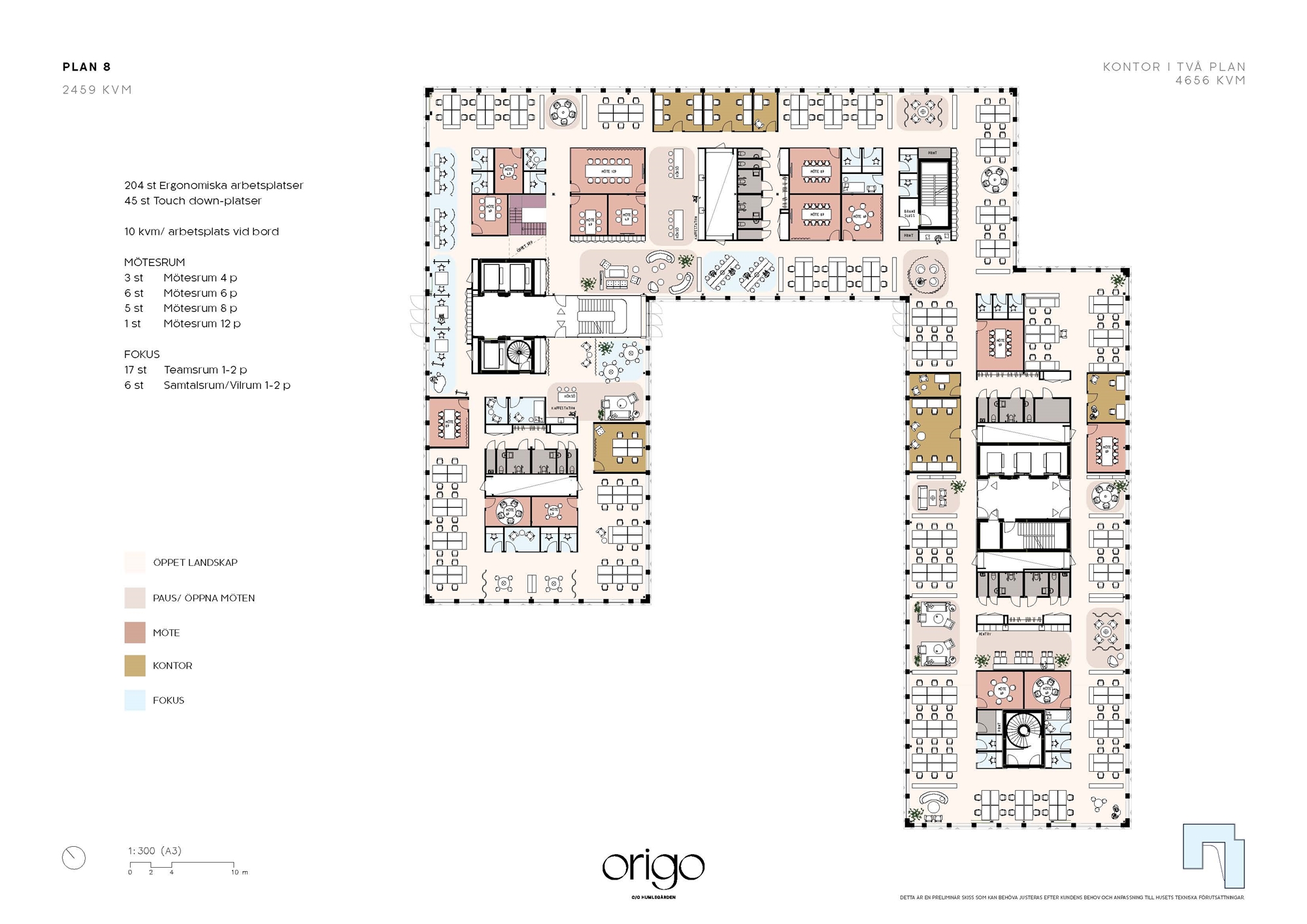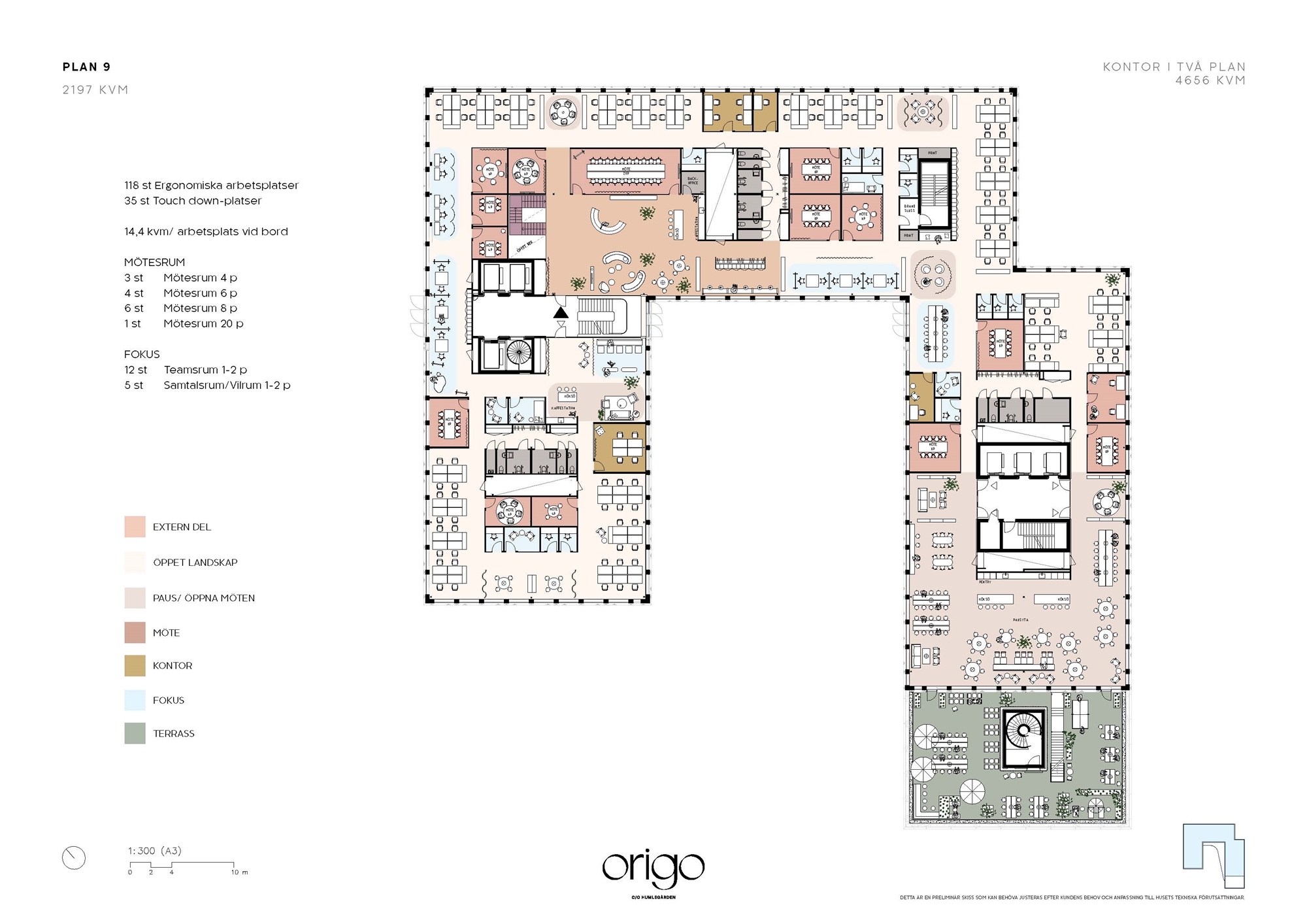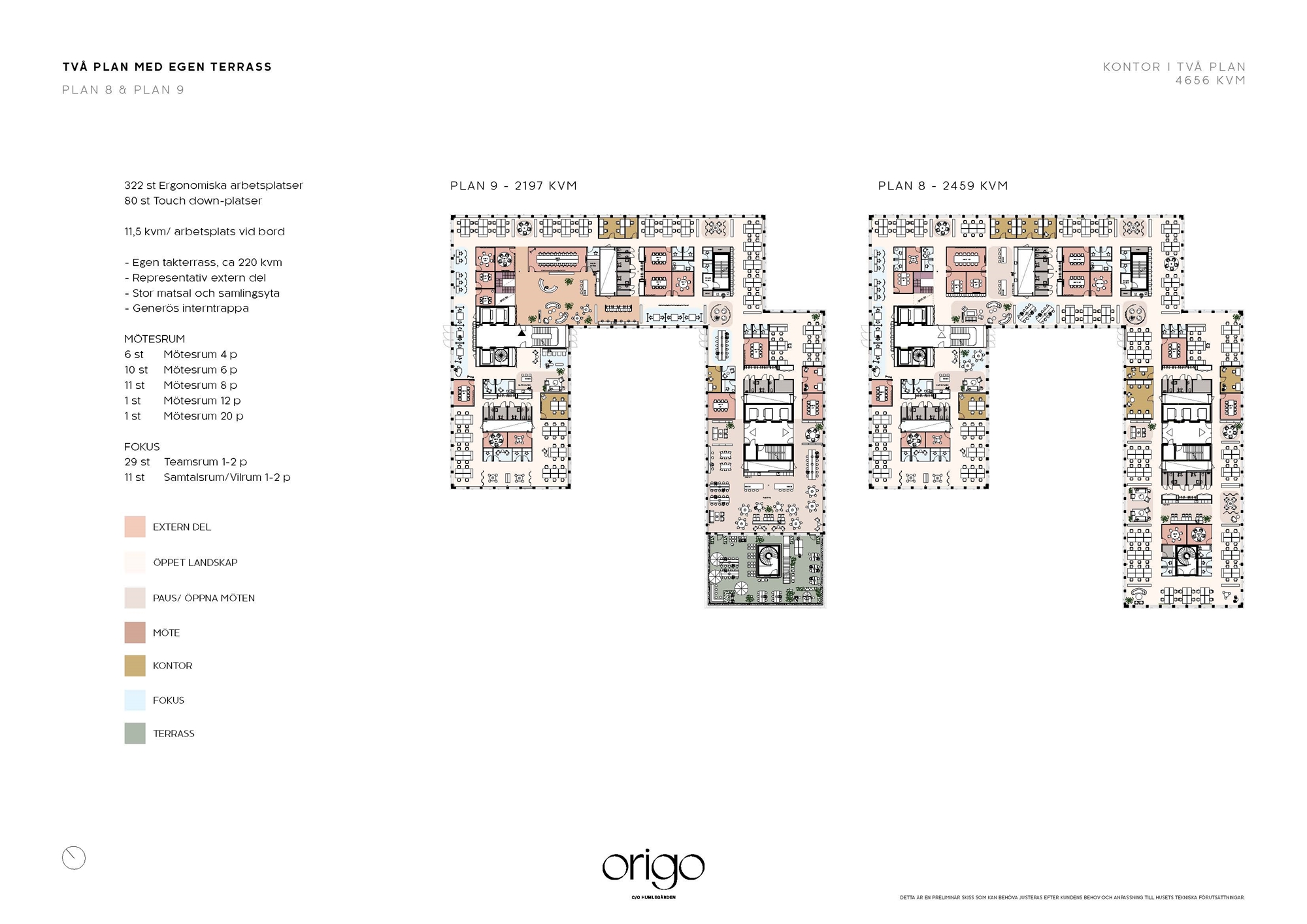 Högt upp i Origo med milsvid utsikt över staden finns en unik lokal med takterrass. Lokalen är en tvåplanslösning på våning 8 och 9 (av 10) och binds samman av en generös interntrapp. Här har ni även nära till husets gemensamma takterrass om 400 kvm med orangeri och utebar. Lokalen är ljus och öppen med generösa fönster och 2,7 m i takhöjd. Inredningen har hållbara materialval i en stilren färgpalett som ger stor frihet att sätta er egen prägel på kontoret med möbler och detaljer. De välplanerade och flexibla ytorna kan hantera ner till 1 person/10 kvm. Huset är energieffektivt och har närvarostyrda ventilations- och belysningssystem, så ni kan få hög persontäthet på under 10kvm vid behov. Installationsgolv tillåter stor frihet i möbleringen. Bifogad planlösning är endast förslag. Vi justerar självklart lokalen utifrån era önskemål. Utöver egna lokaler har ni tillgång till husets alla faciliteter så som gemensamma ytor för möten och sociala sammankomster, konferensytor, reception, café, bar, restaurang, takterrasser, gym, duschar och omklädningsrum.