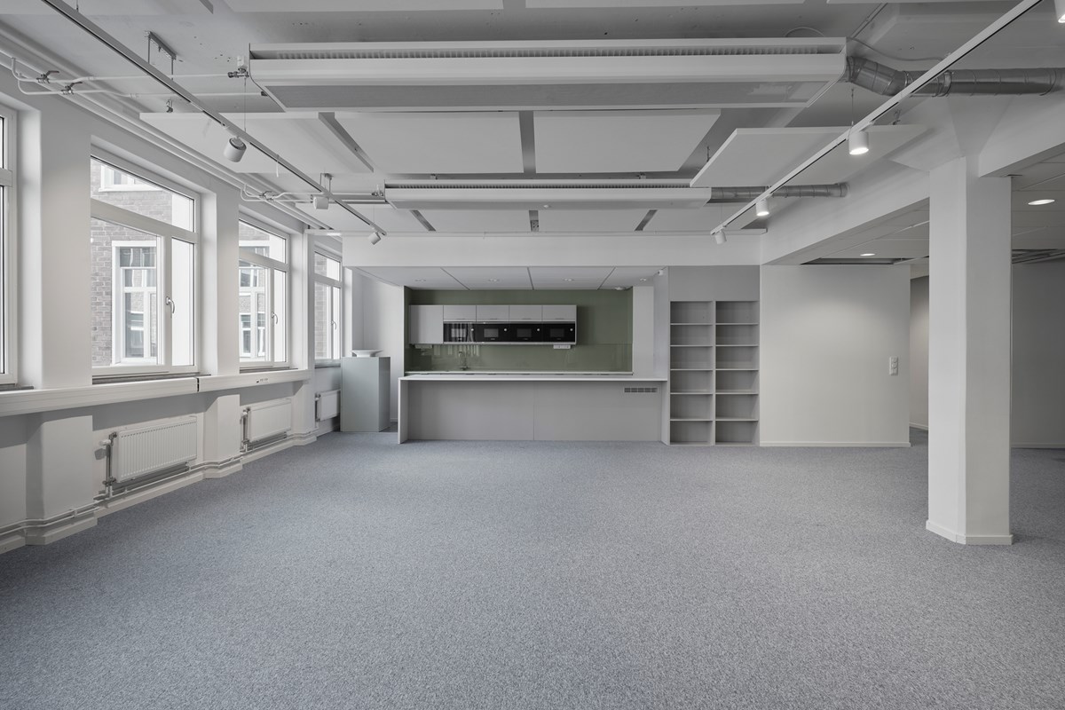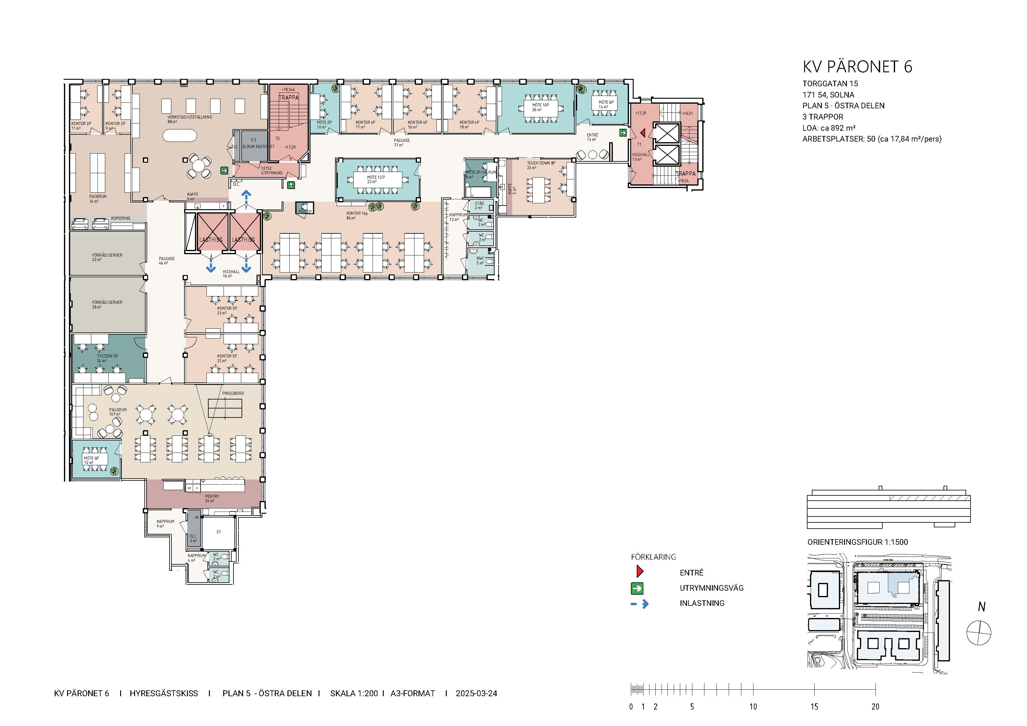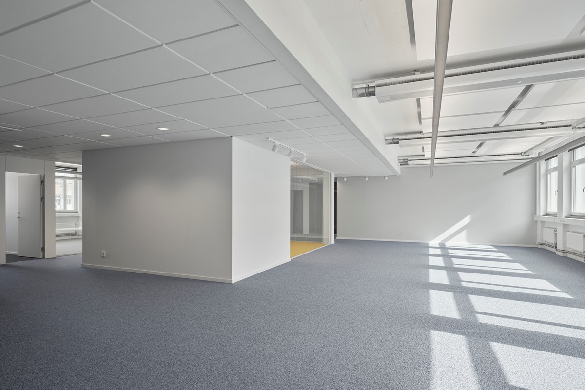 Lokalen om 892 kvadrat rymmer cirka 50 arbetsplatser i en mix av öppna ytor och stängda kontorsrum. Här finns mötesrum i varierande storlek, allt från små samtalsrum till konferensrum upp till 12 personer. Den stora matsalen öppnar upp och bjuder in med välutrustat pentry och loungehörna för gemensamma pauser och events. Planlösningen möjliggör även utställning, lättare verkstad eller förråd i avgränsad yta.
