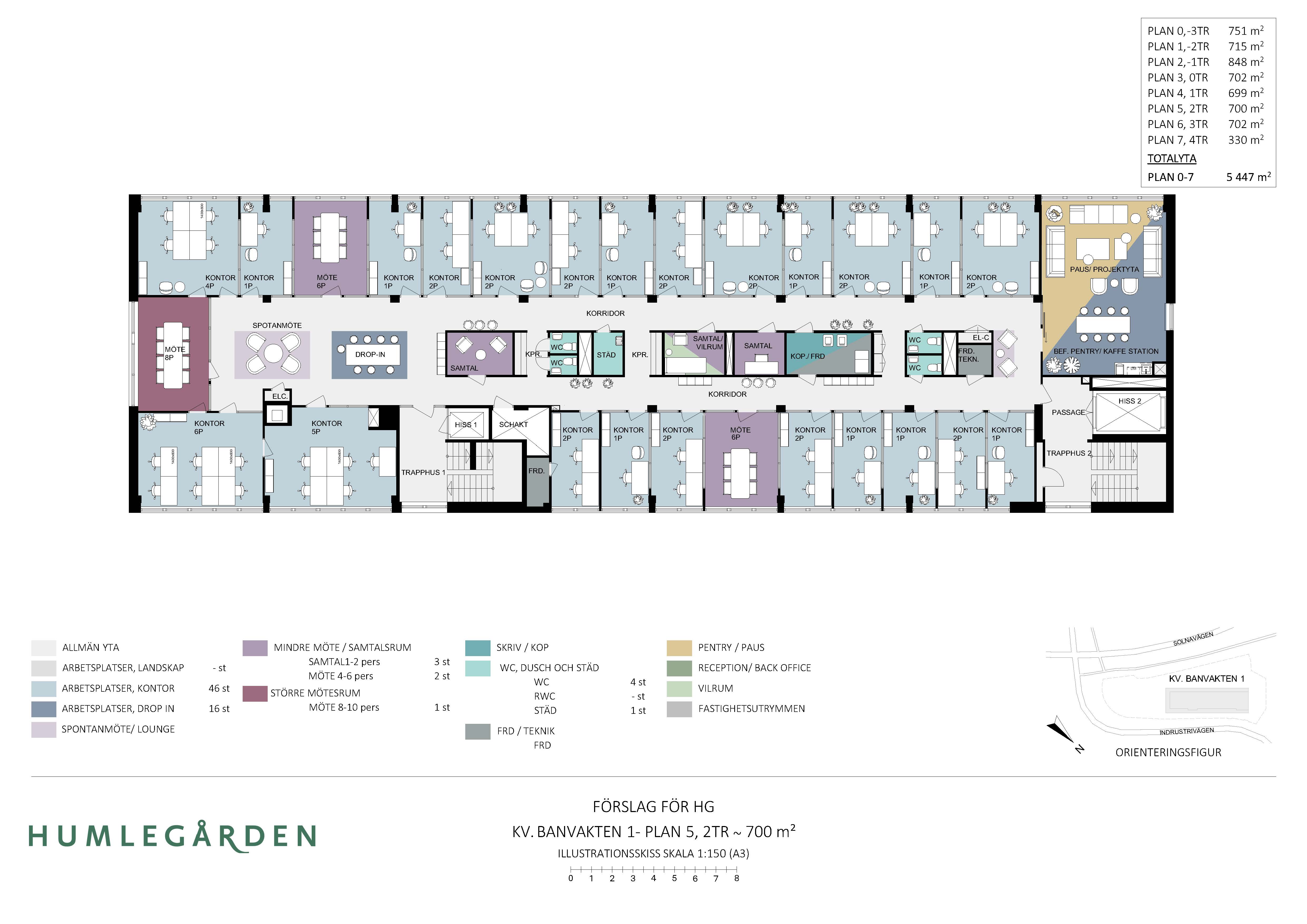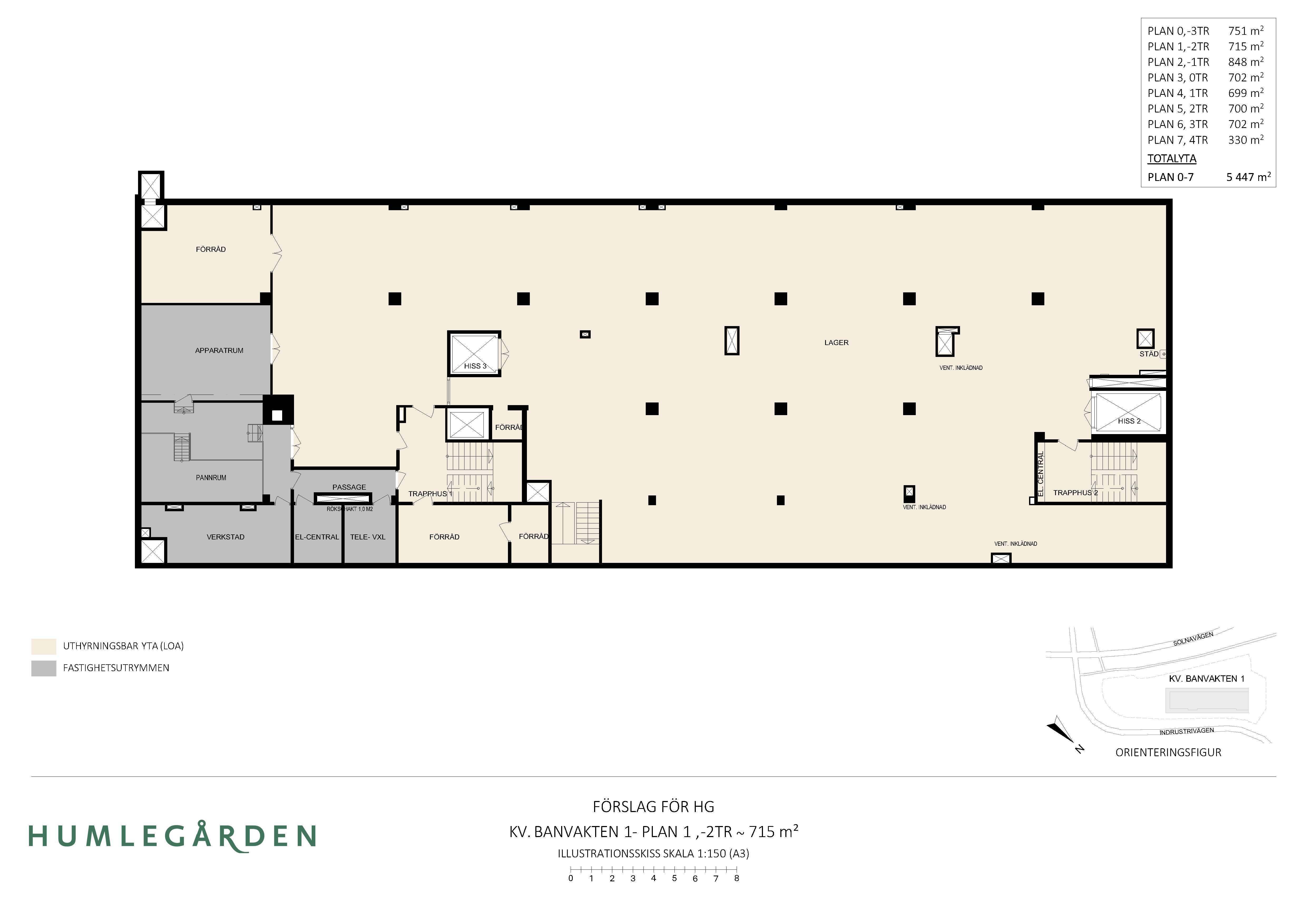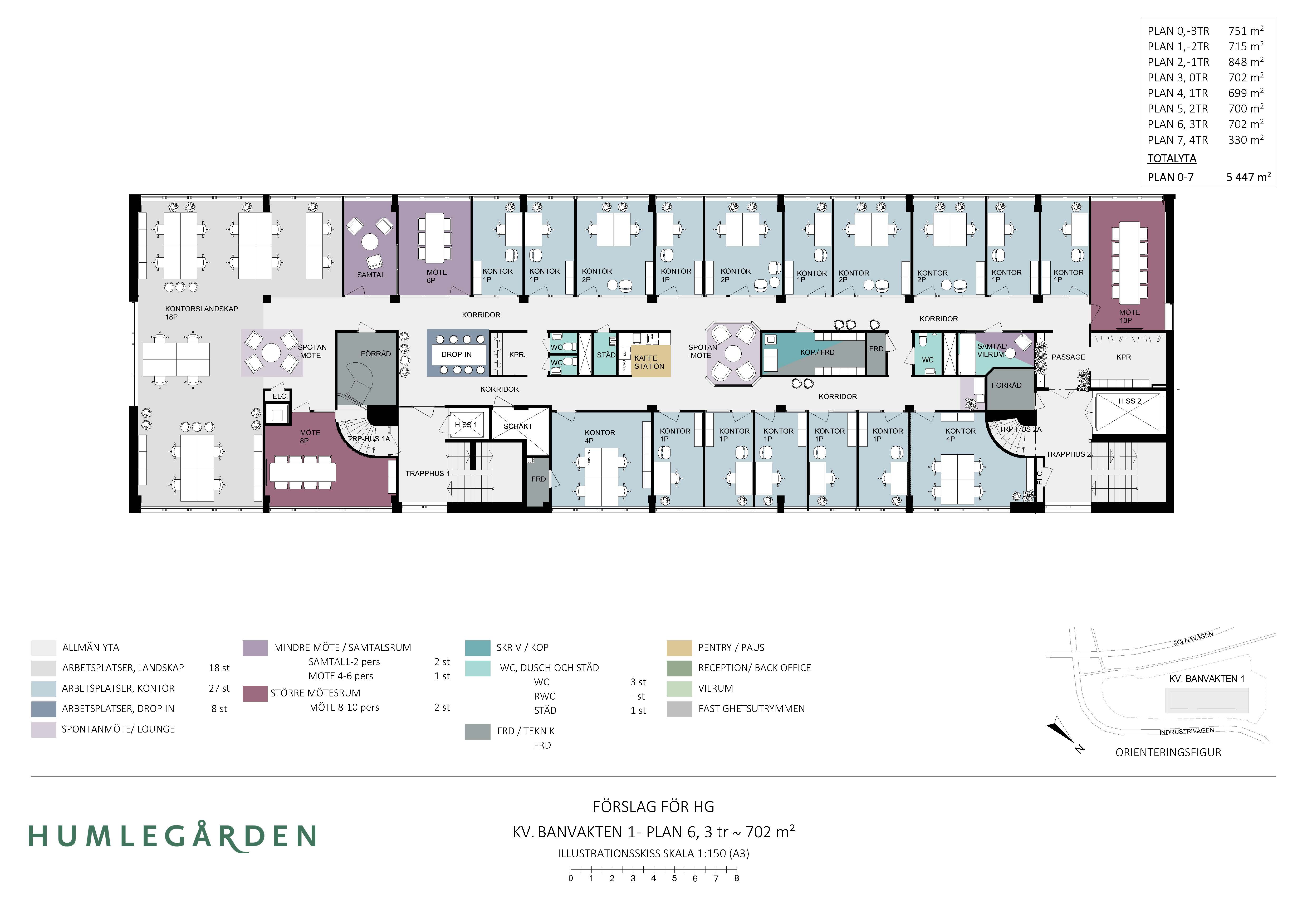 Huset med 8 våningar erbjuder stor flexibilitet och möjlighet att forma ytorna efter verksamhetens behov. Lokalen på totalt 5 447 kvm består av 3 133 kvm kontorsyta, 1 466 kvm lager samt ett sutterängplan för lager/kontor på 848 kvm. Här finns även smidiga logistiklösningar med lastkaj och lasthiss. Stora fönster i olika väderstreck skapar en ljus och inspirerande arbetsmiljö. Mötesrum i olika storlekar, en hörsal för upp till 50 personer samt öppna ytor för gemenskap ger plats för både arbete och avkoppling.