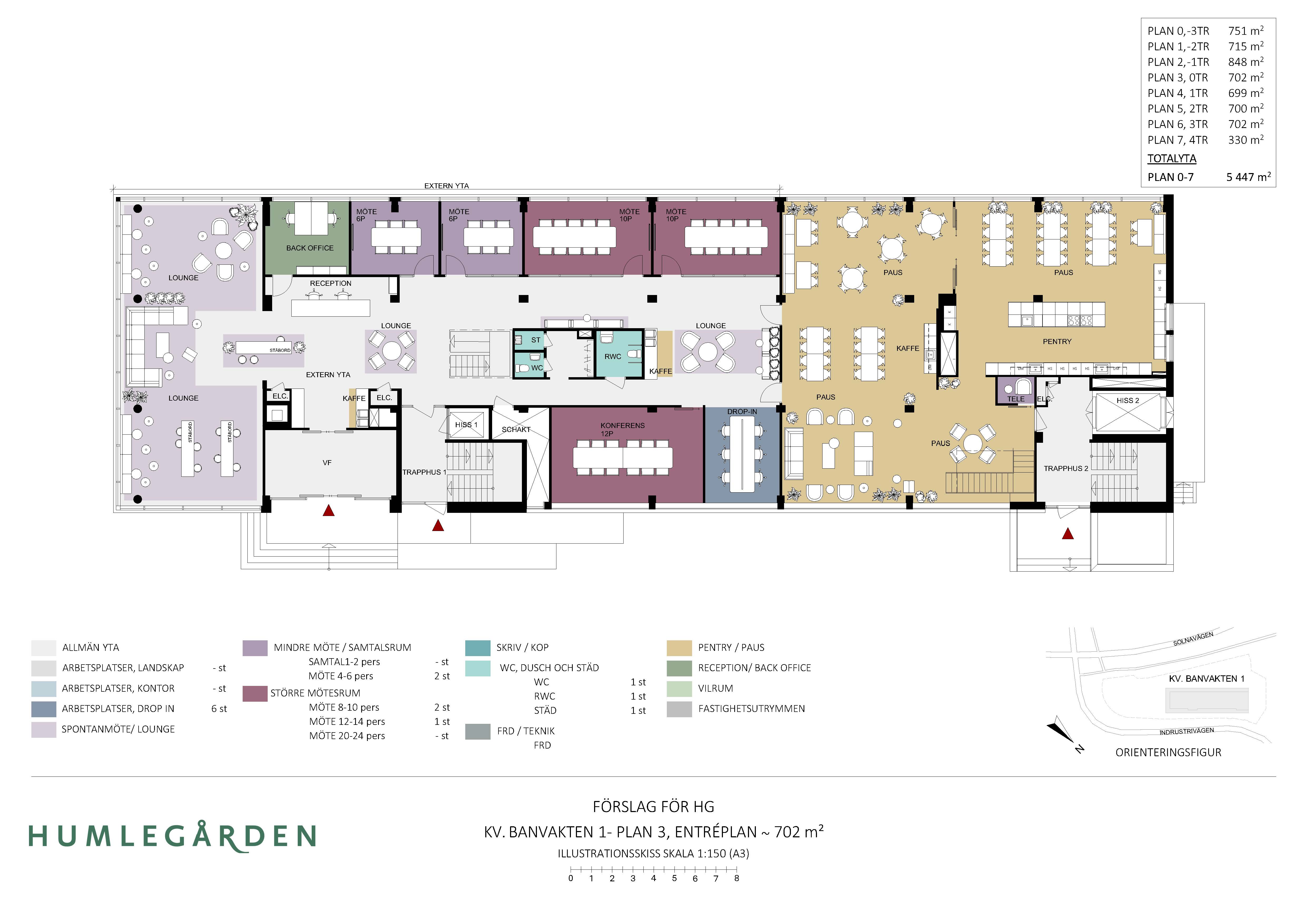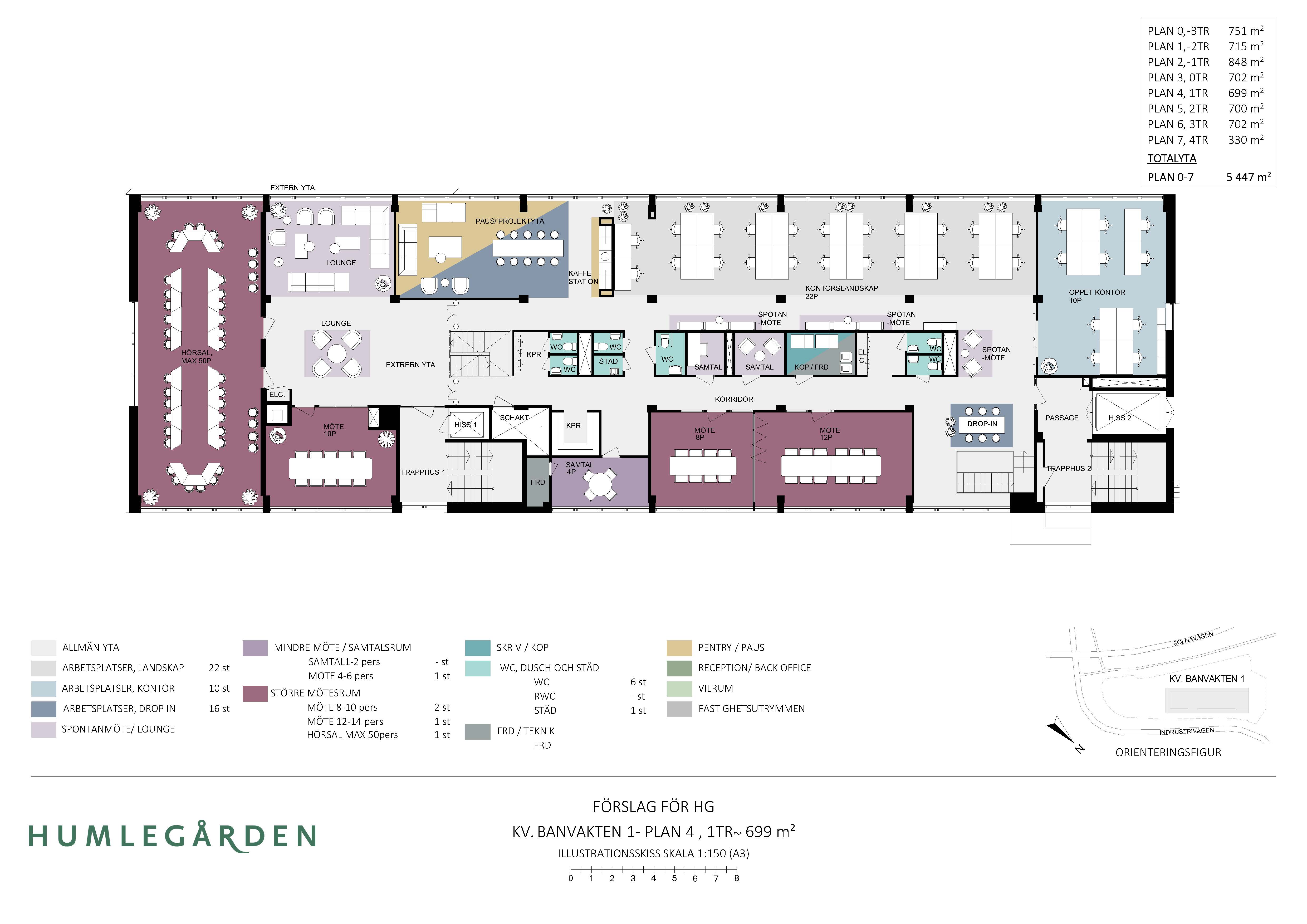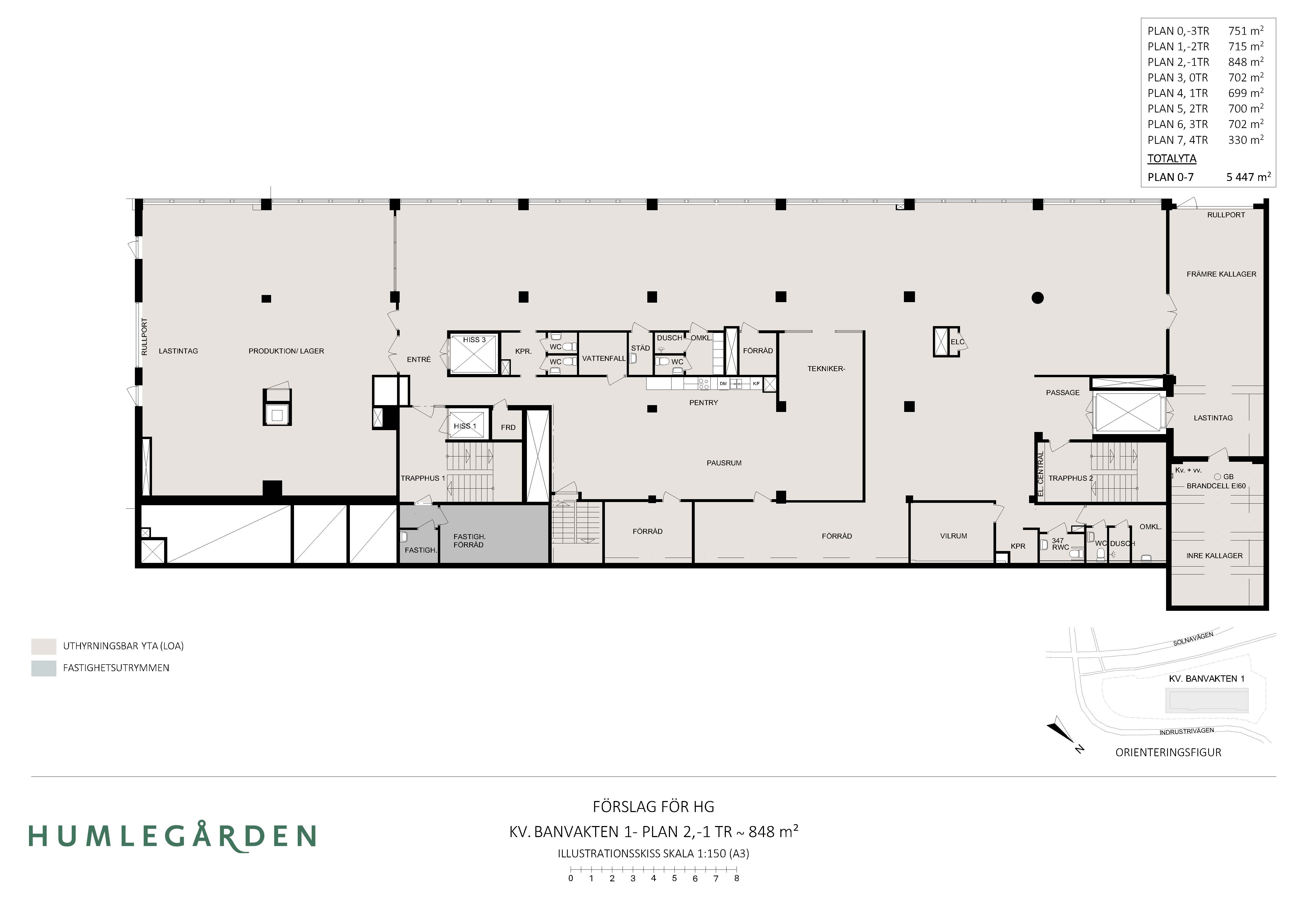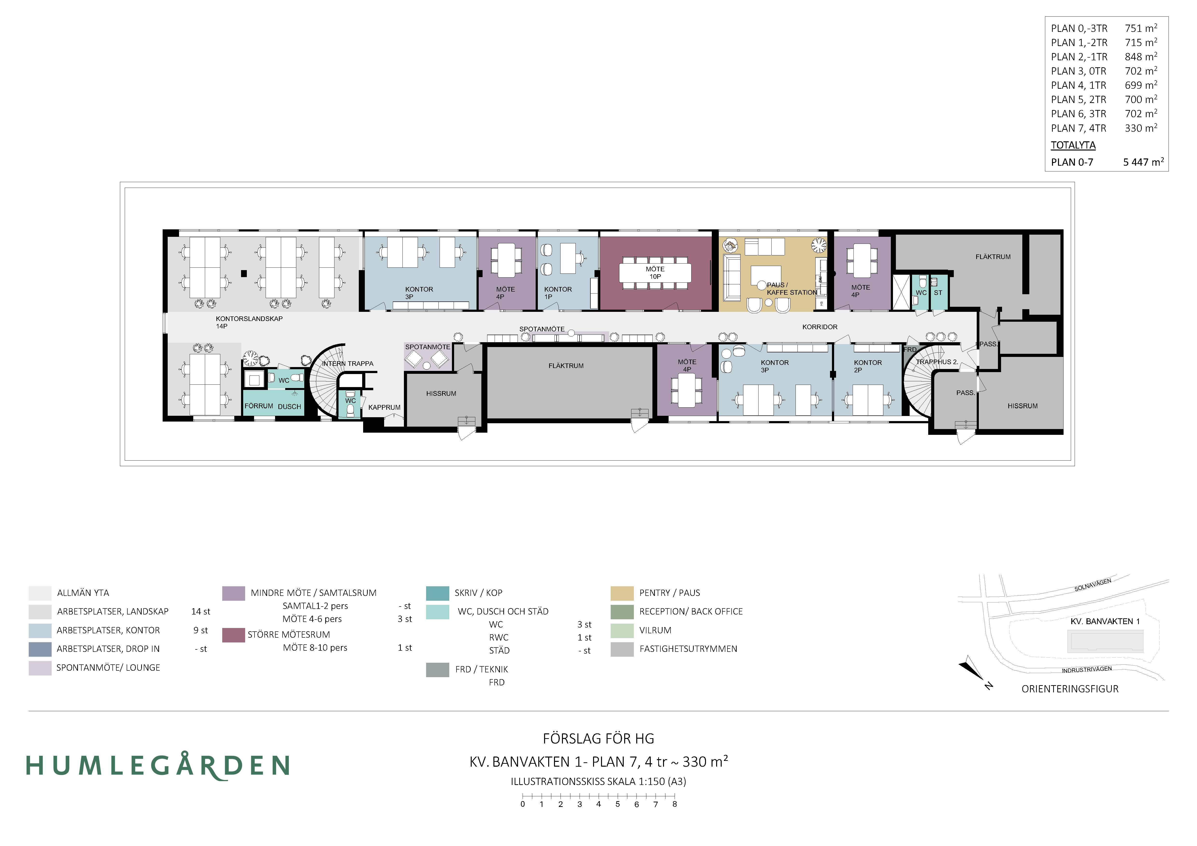 Huset med 8 våningar erbjuder stor flexibilitet och möjlighet att forma ytorna efter verksamhetens behov. Lokalen på totalt 5 447 kvm består av 3 133 kvm kontorsyta, 1 466 kvm lager samt ett sutterängplan för lager/kontor på 848 kvm. Här finns även smidiga logistiklösningar med lastkaj och lasthiss. Stora fönster i olika väderstreck skapar en ljus och inspirerande arbetsmiljö. Mötesrum i olika storlekar, en hörsal för upp till 50 personer samt öppna ytor för gemenskap ger plats för både arbete och avkoppling.