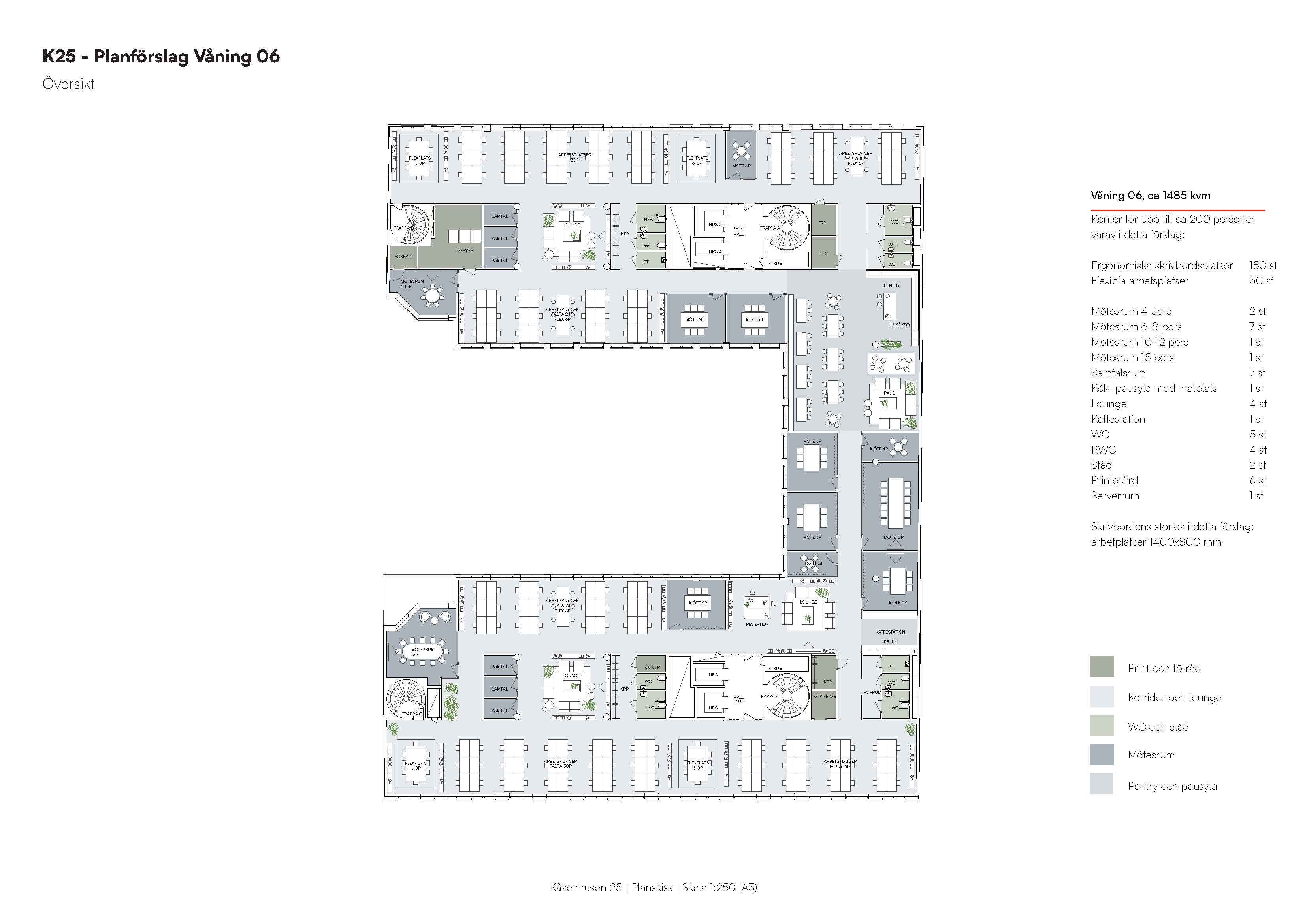 Lokalen på plan 6 är planerad med fokus på både funktion och flexibilitet. Kontoret har en tydlig uppdelning mellan externa ytor för möten och interna arbetsplatser. Här finns ett öppet kontorslandskap, mötesrum i olika storlekar och tysta zoner för ostört arbete. I det öppna pentryt kan medarbetarna samlas för gemensamma pauser. Företag med tillväxtplaner har möjlighet att hyra ytterligare en våning (766 kvm på plan 7), som kan kopplas samman via en interntrappa.
