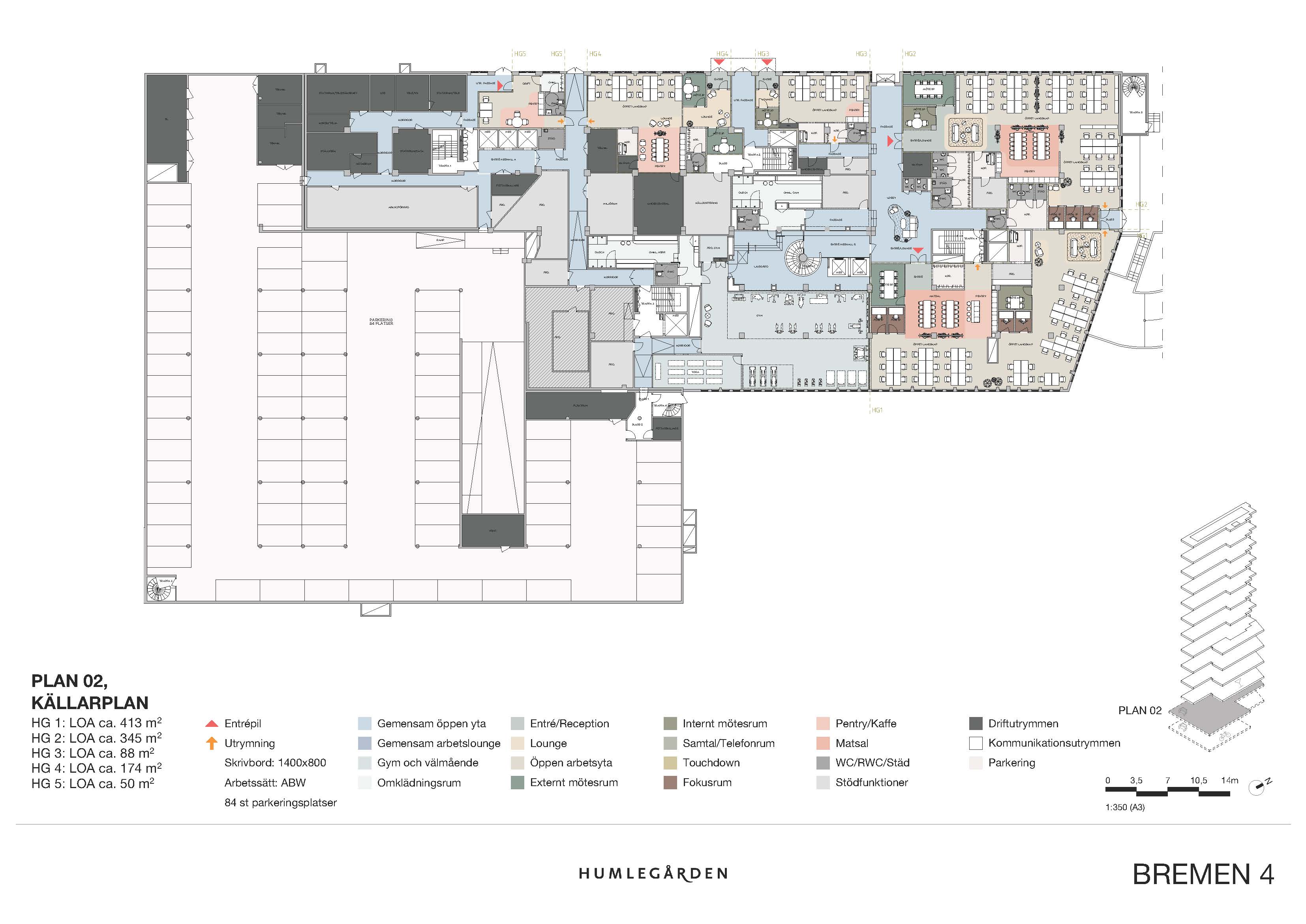 Parkeringsplatser finns i garaget som sträcker sig över två plan.