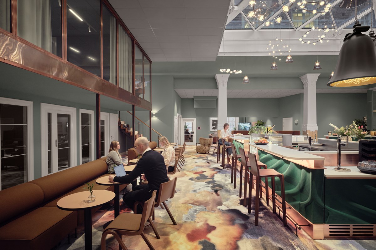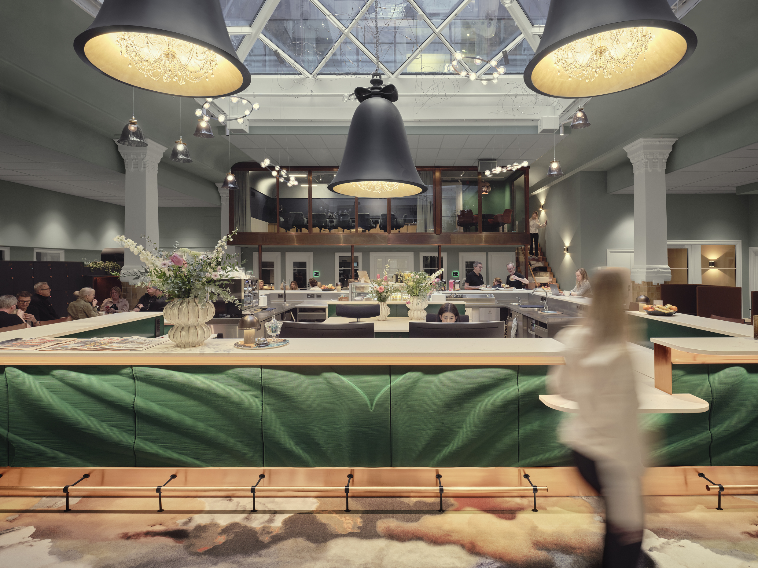 – Det här är husets självklara mötesplats där medarbetare, kunder och besökare möts och hämtar energi. Ljus, musik, färger, grönska och material samverkar för att skapa en varm och välkomnande känsla, berättar Marie.