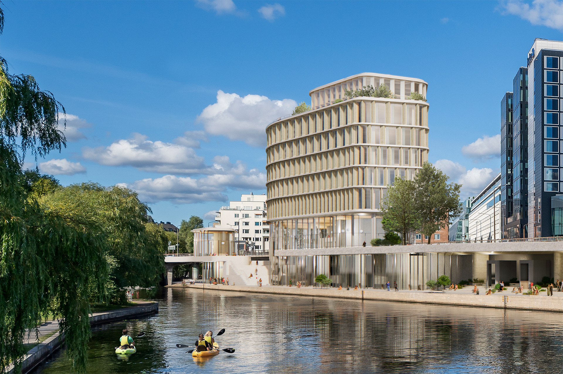 Den nya bebyggelsen möjliggörs genom att Stockholms stad däckar över delar av Klarastrandsleden, ett arbete som bedöms kunna starta under 2027 och preliminär byggstart äger rum under 2029.
